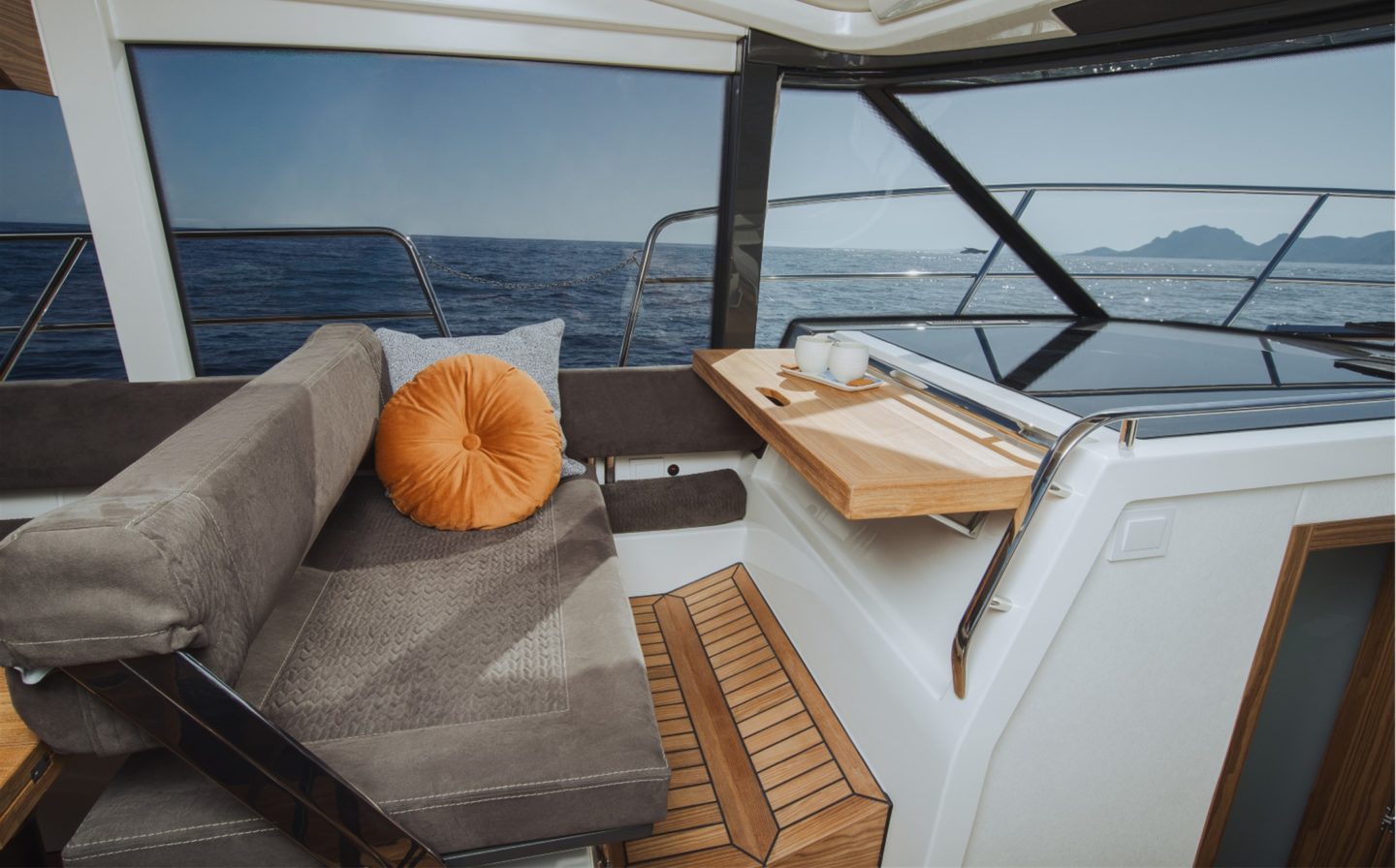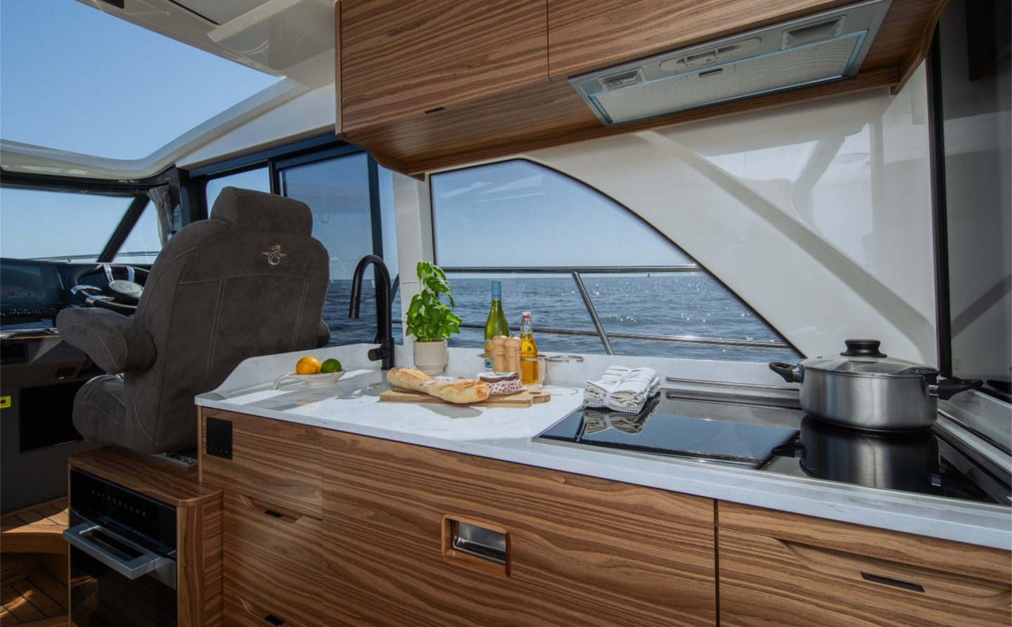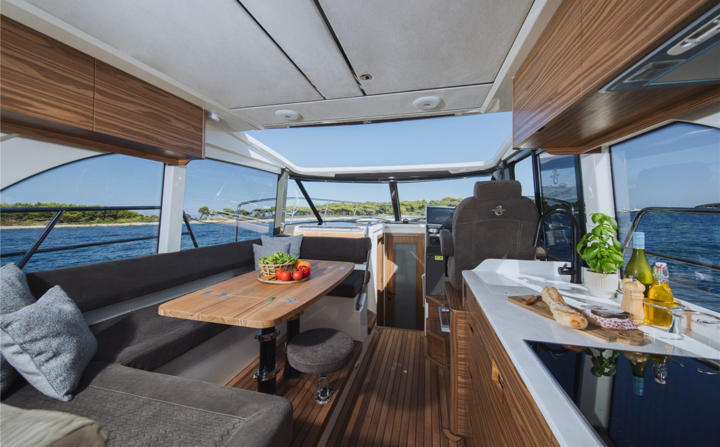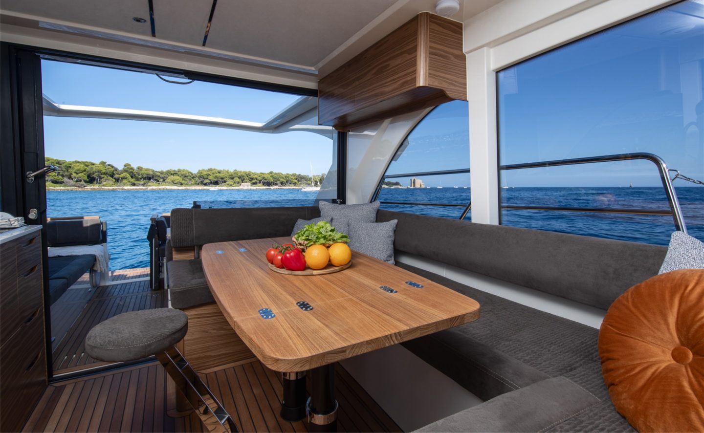 The now familiar Scandinavia format means a generous aft cockpit area, protected by Marex’s legendary curtain cover system for complete flexibility, regardless of the weather. This brilliantly sociable space then leads in through sliding doors to the inner cockpit area with another large seating and dining area, opposite a well-equipped galley on the starboard side. Ahead of that is an ergonomically designed helm station with new adjustable helm seat and a sliding glass door for convenient direct access to the side deck.