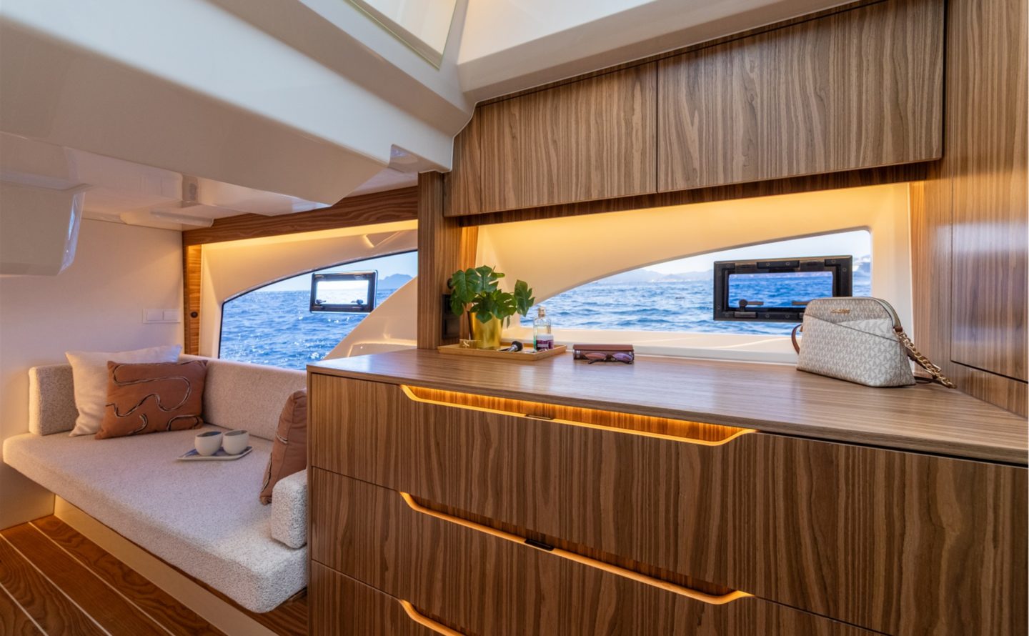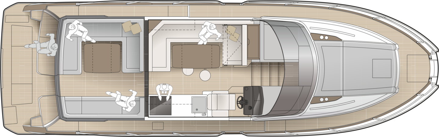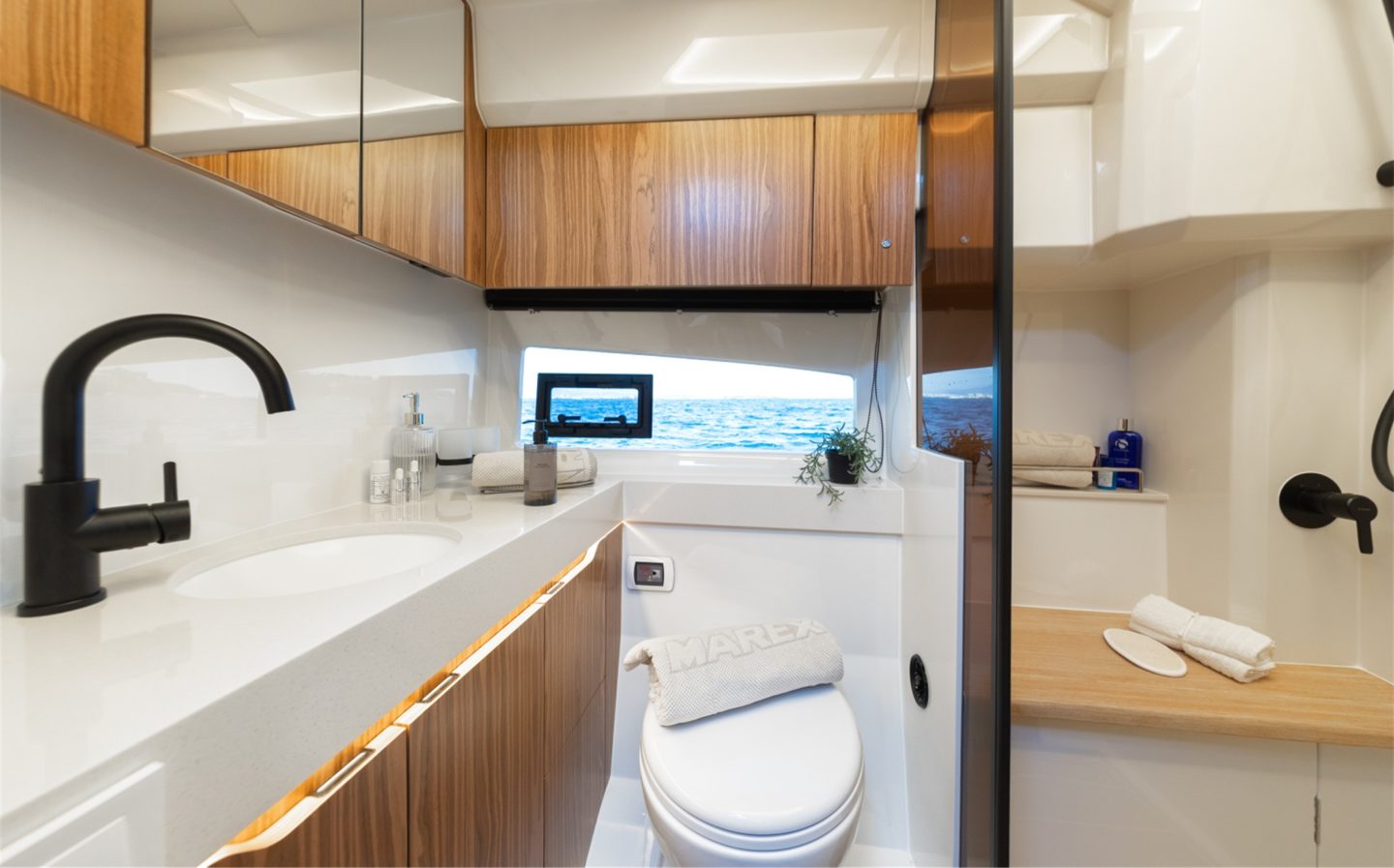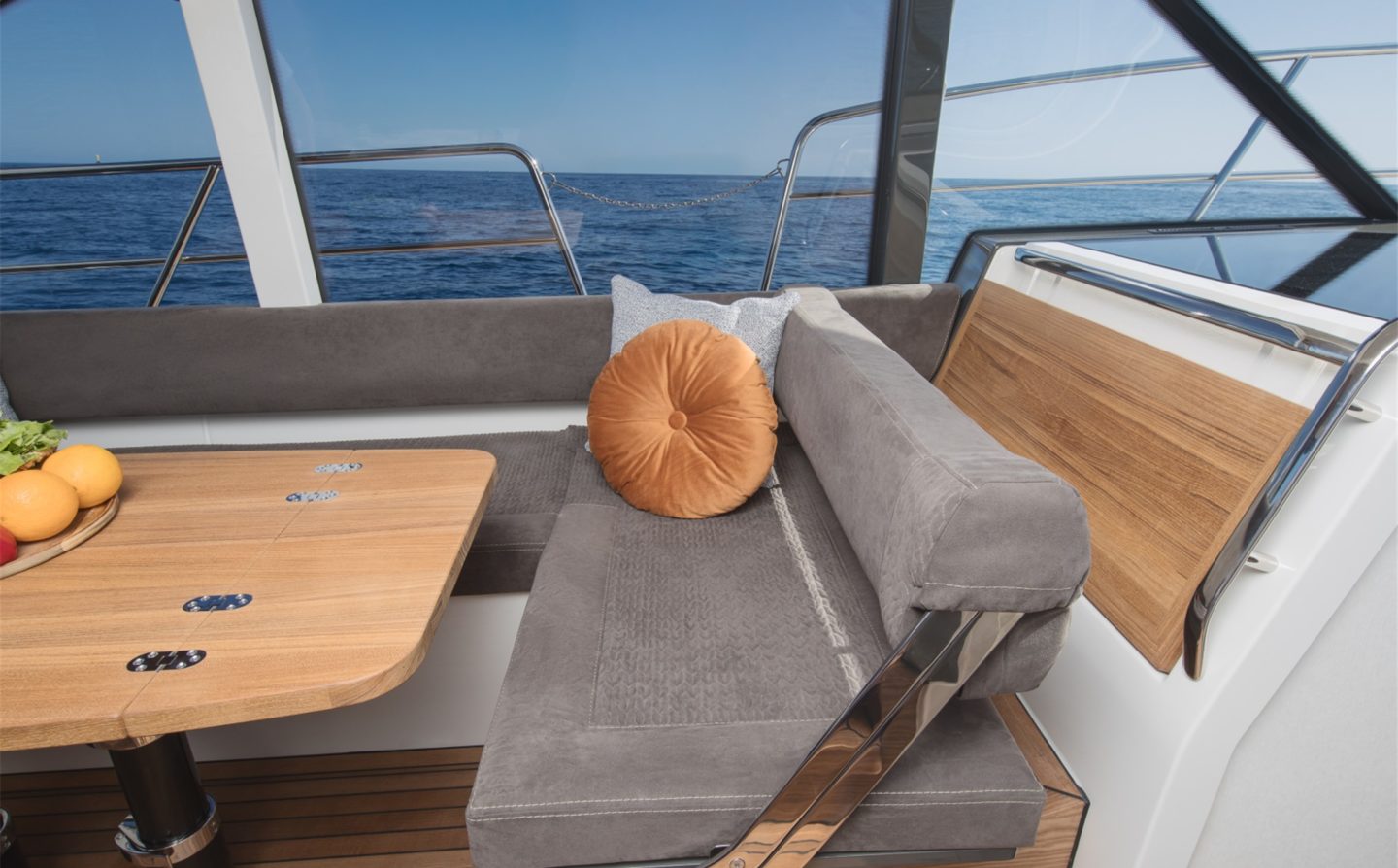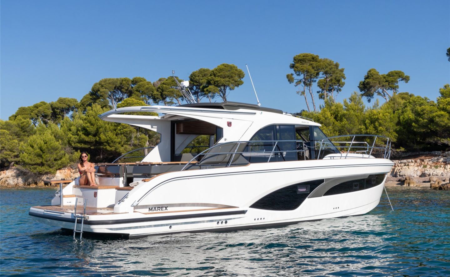 The now familiar Scandinavia format means a generous aft cockpit area, protected by Marex’s legendary curtain cover system for complete flexibility, regardless of the weather. This brilliantly sociable space then leads in through sliding doors to the inner cockpit area with another large seating and dining area, opposite a well-equipped galley on the starboard side. Ahead of that is an ergonomically designed helm station with new adjustable helm seat and a sliding glass door for convenient direct access to the side deck.