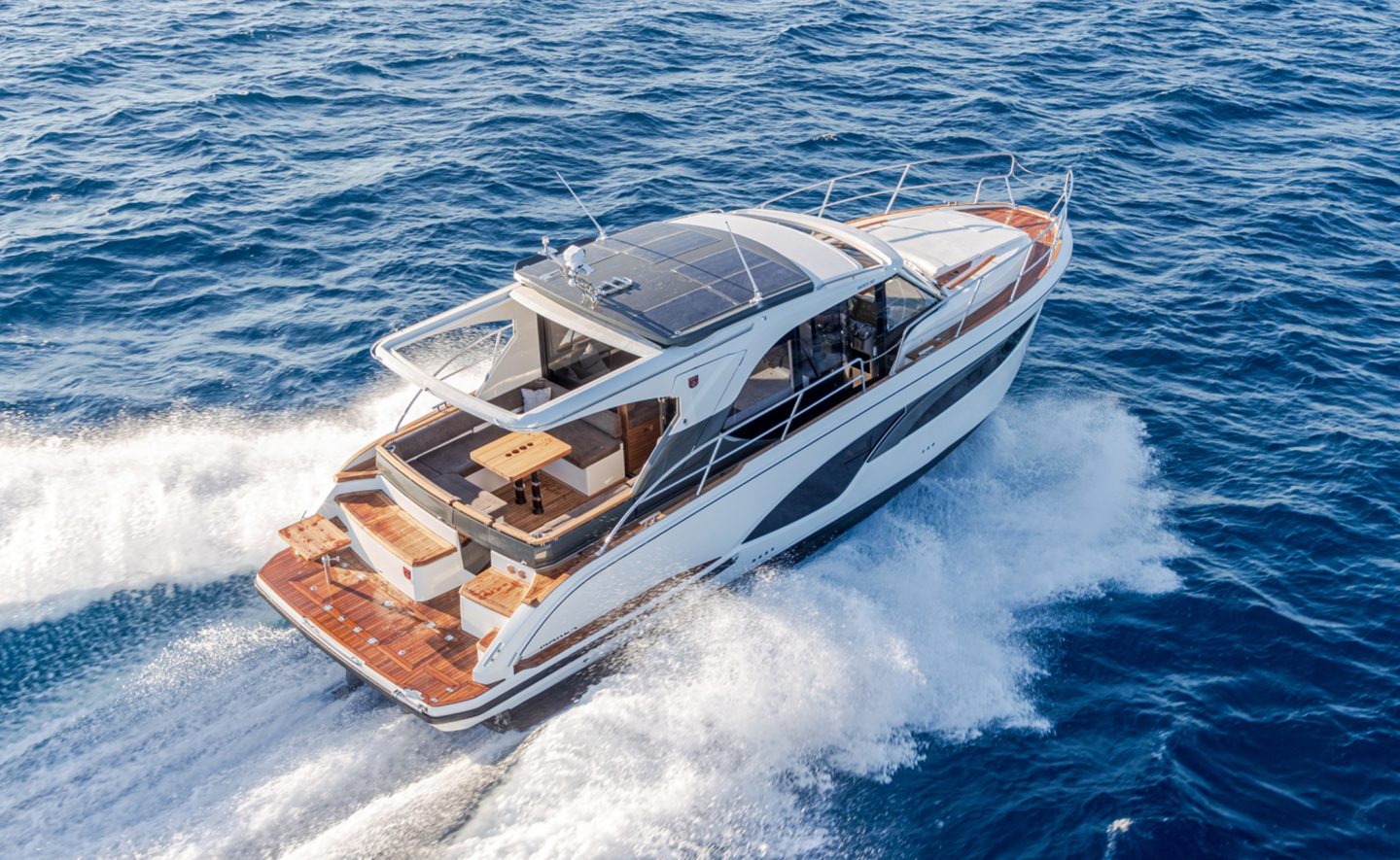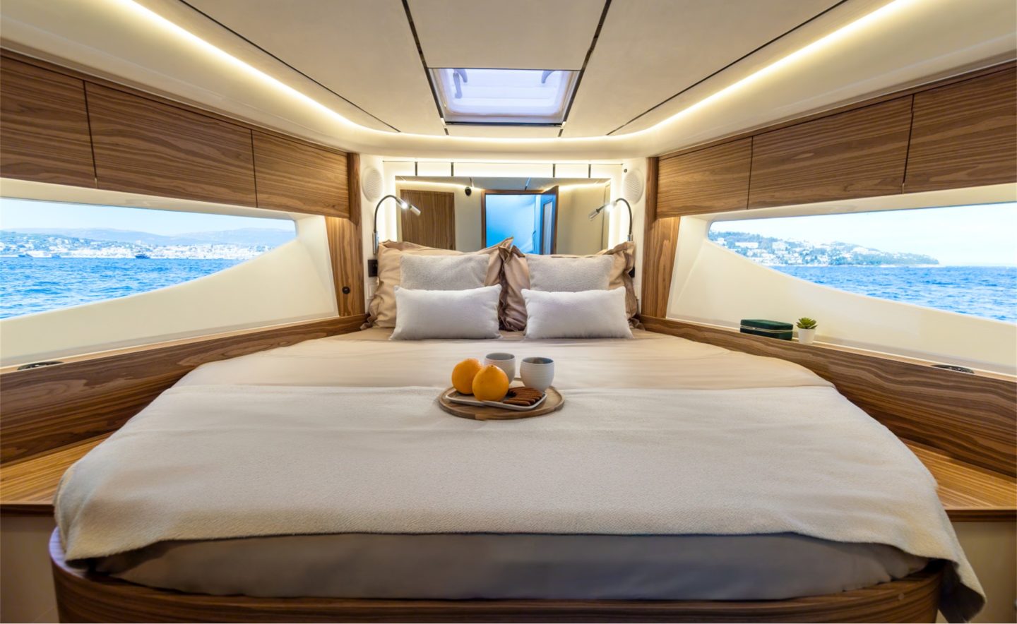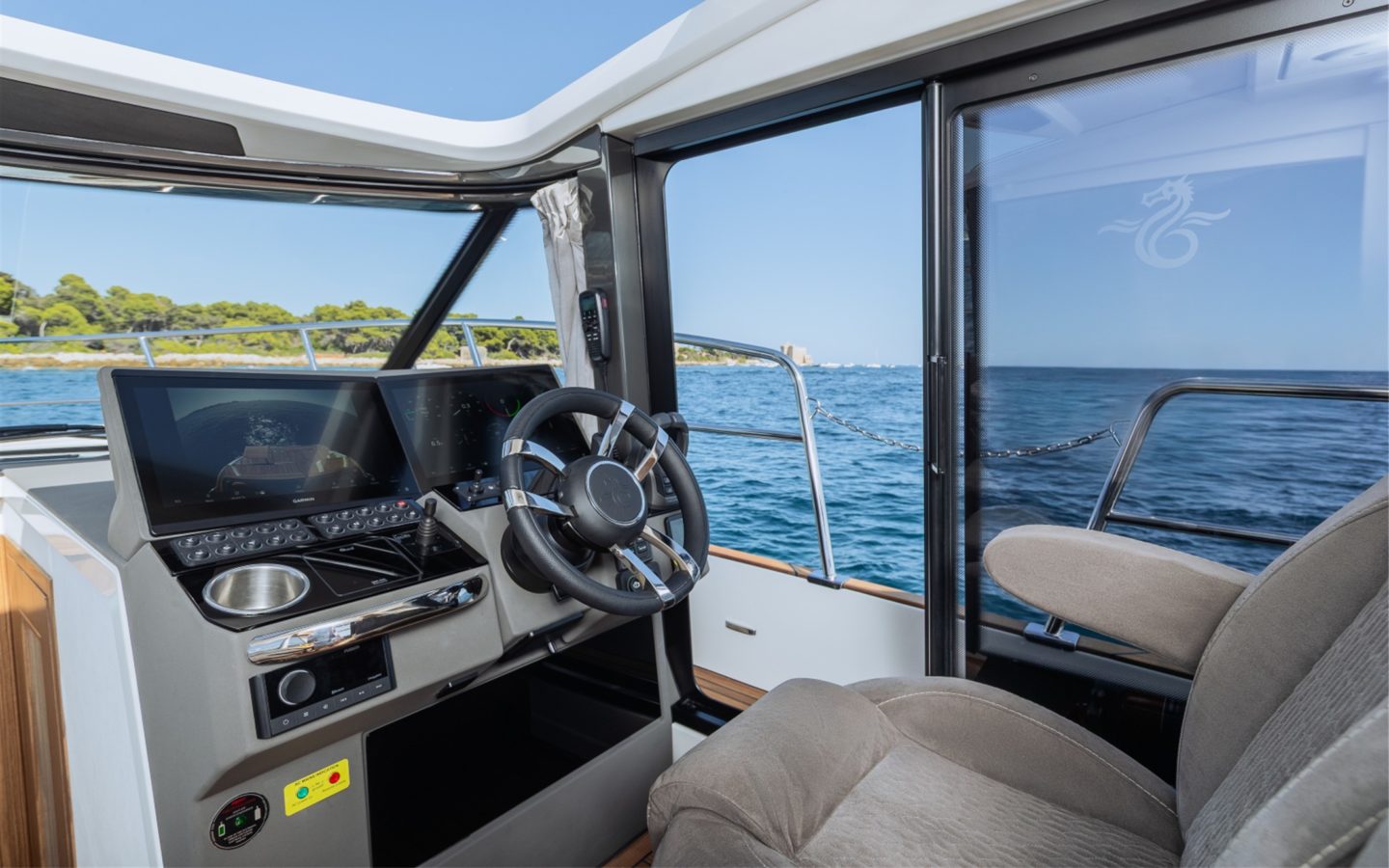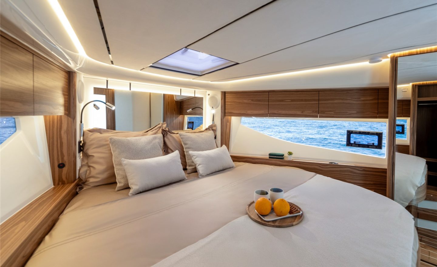 The now familiar Scandinavia format means a generous aft cockpit area, protected by Marex’s legendary curtain cover system for complete flexibility, regardless of the weather. This brilliantly sociable space then leads in through sliding doors to the inner cockpit area with another large seating and dining area, opposite a well-equipped galley on the starboard side. Ahead of that is an ergonomically designed helm station with new adjustable helm seat and a sliding glass door for convenient direct access to the side deck.