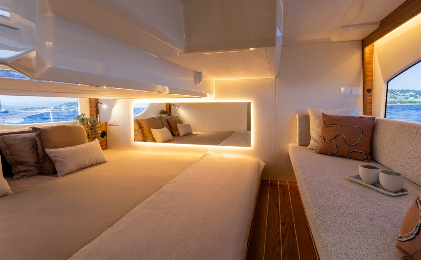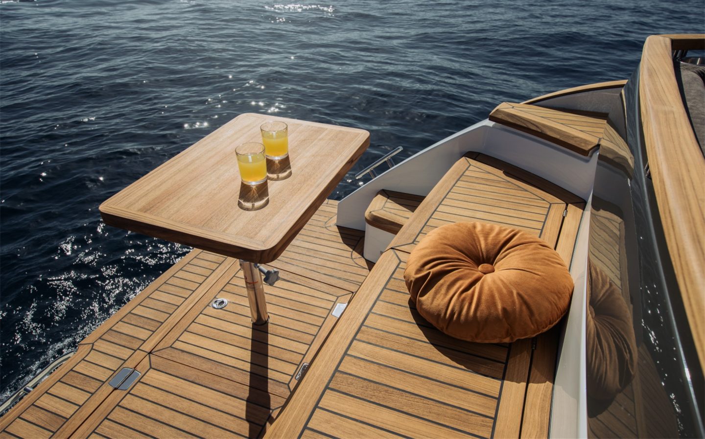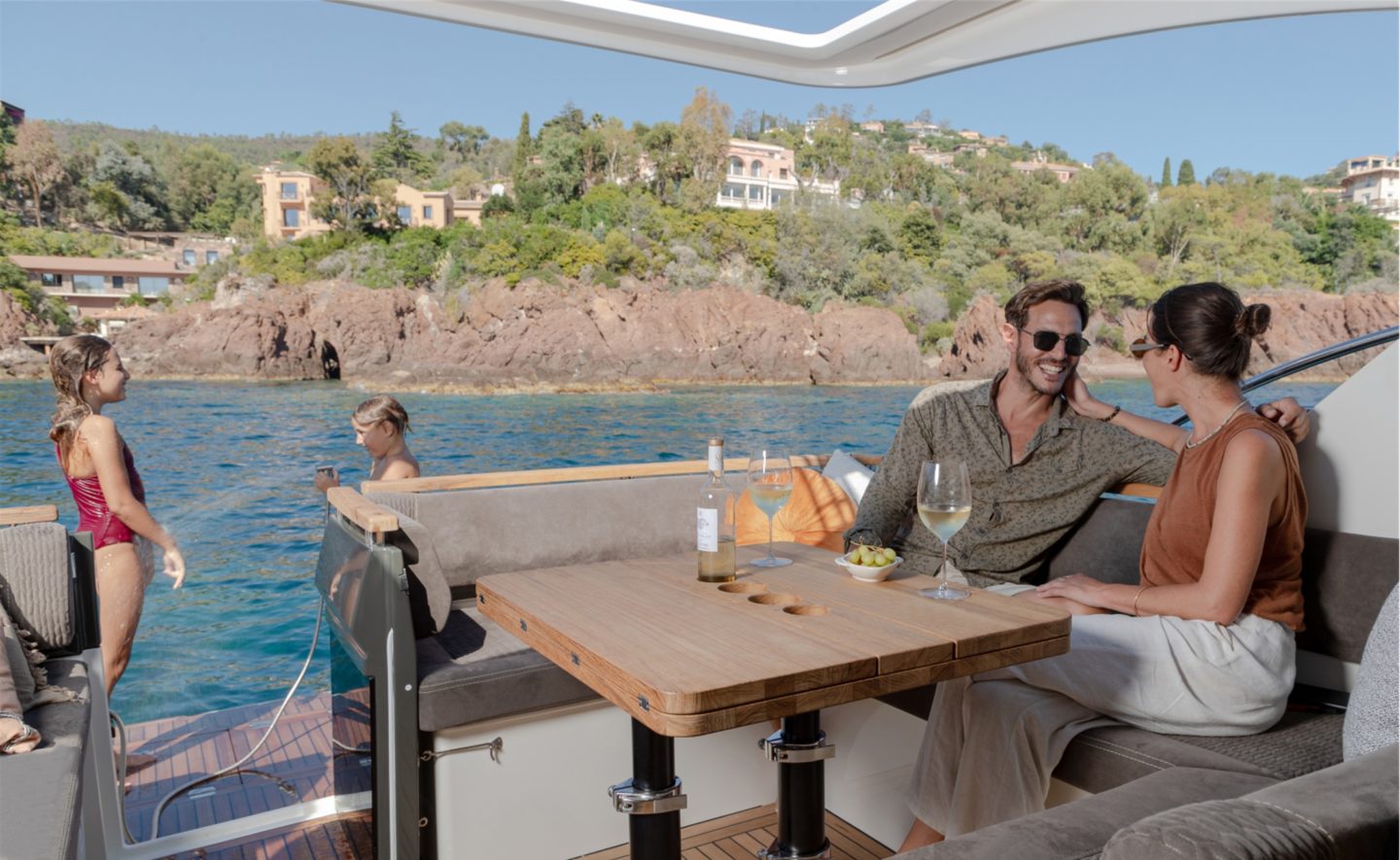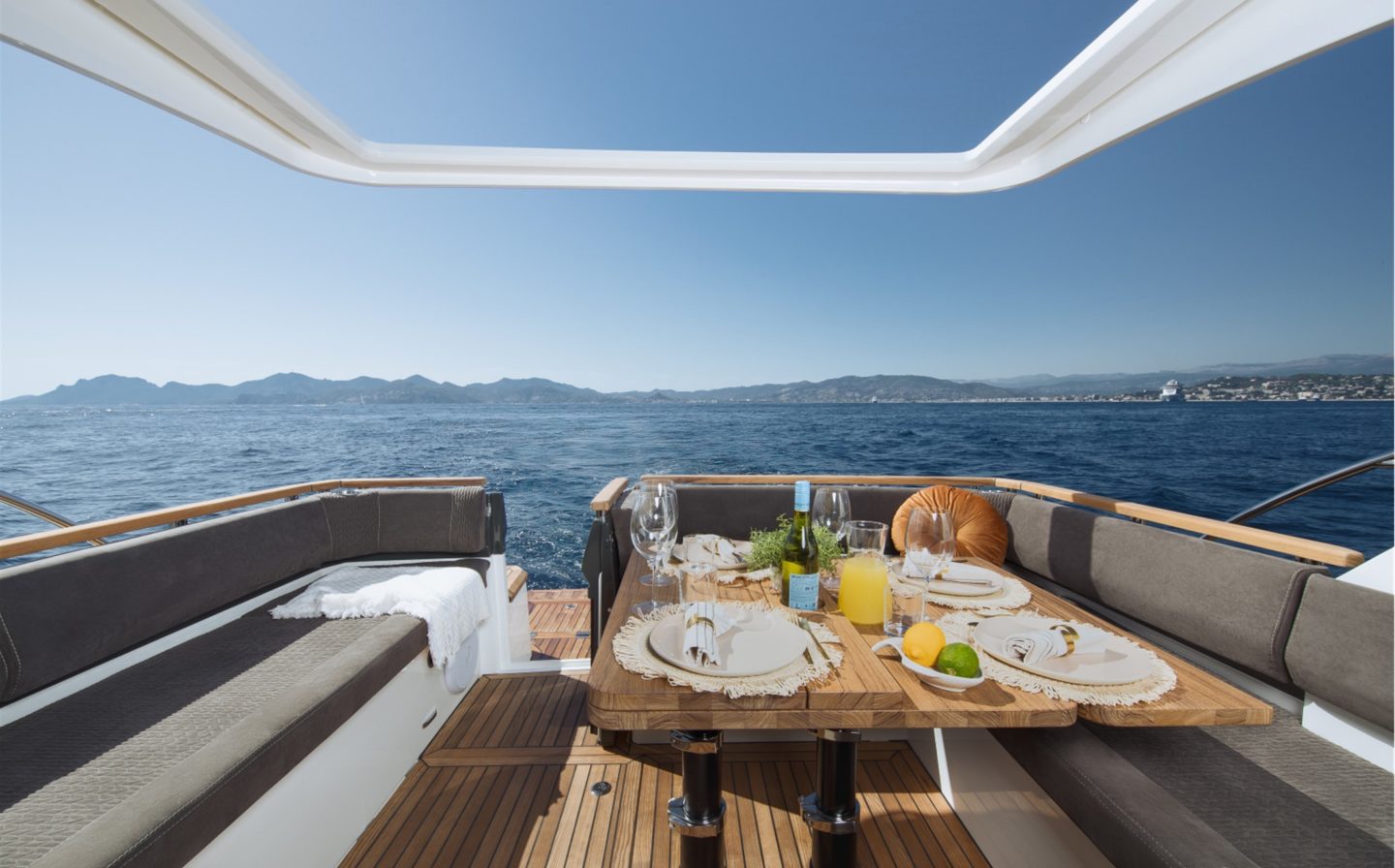The now familiar Scandinavia format means a generous aft cockpit area, protected by Marex’s legendary curtain cover system for complete flexibility, regardless of the weather. This brilliantly sociable space then leads in through sliding doors to the inner cockpit area with another large seating and dining area, opposite a well-equipped galley on the starboard side. Ahead of that is an ergonomically designed helm station with new adjustable helm seat and a sliding glass door for convenient direct access to the side deck.