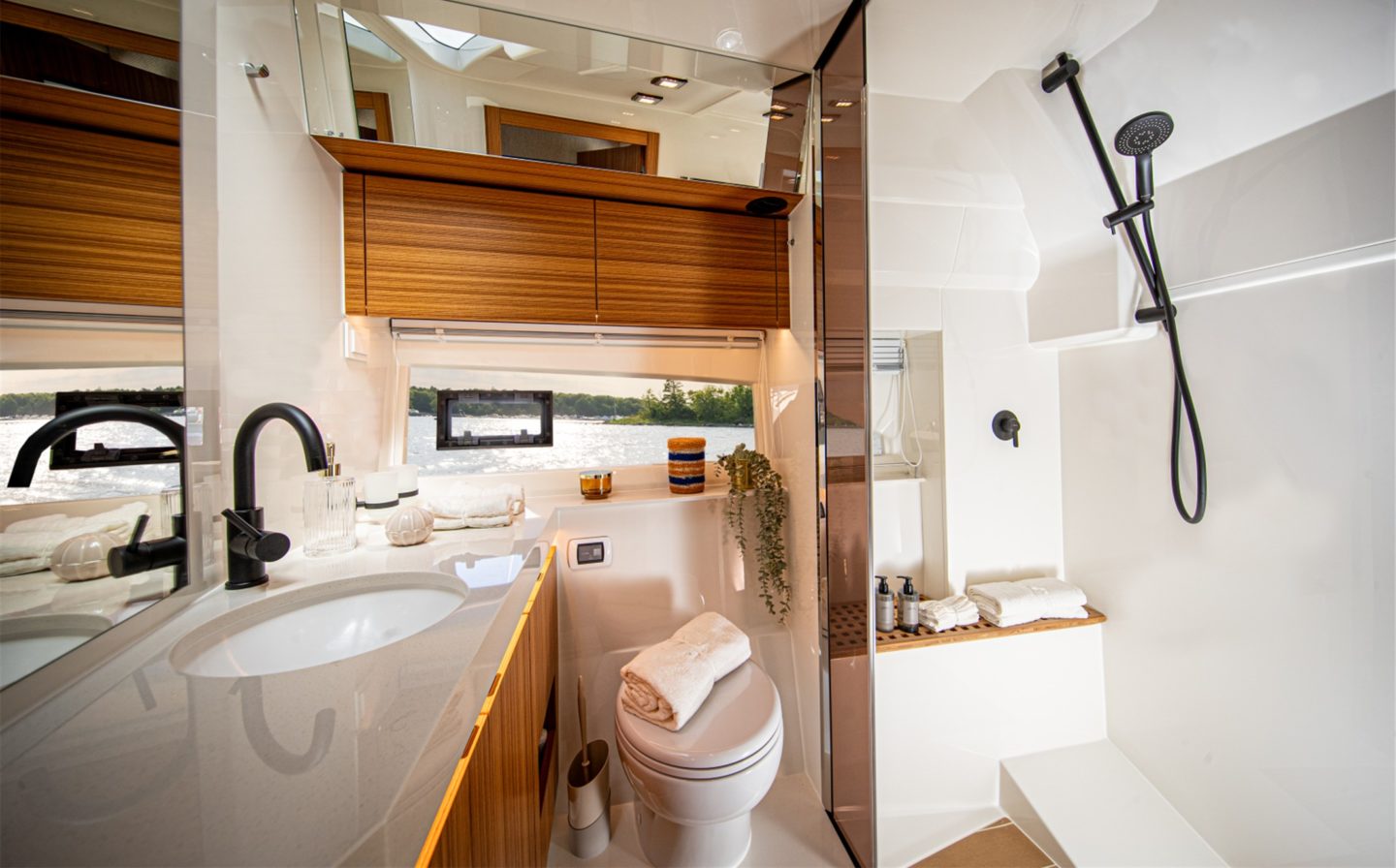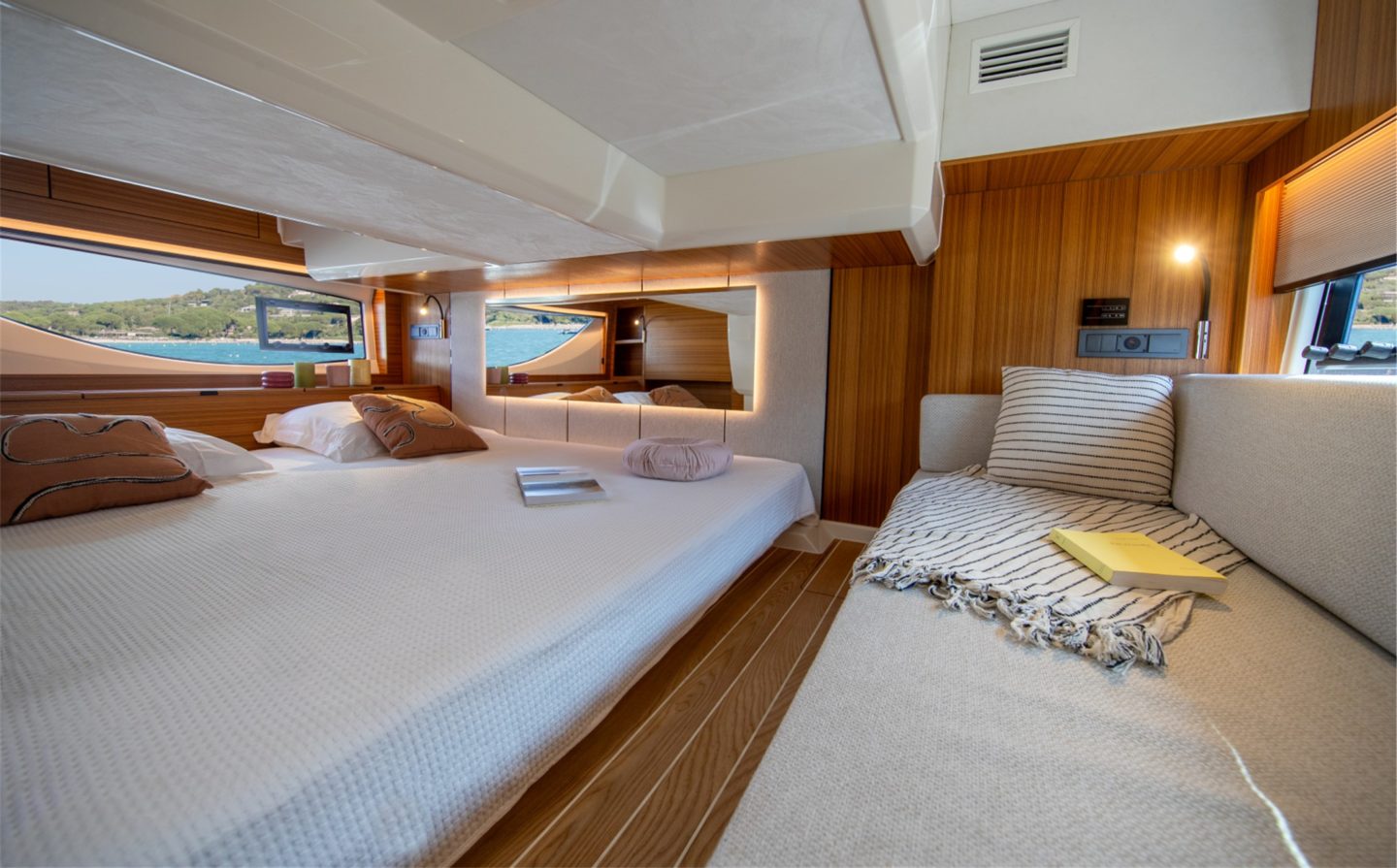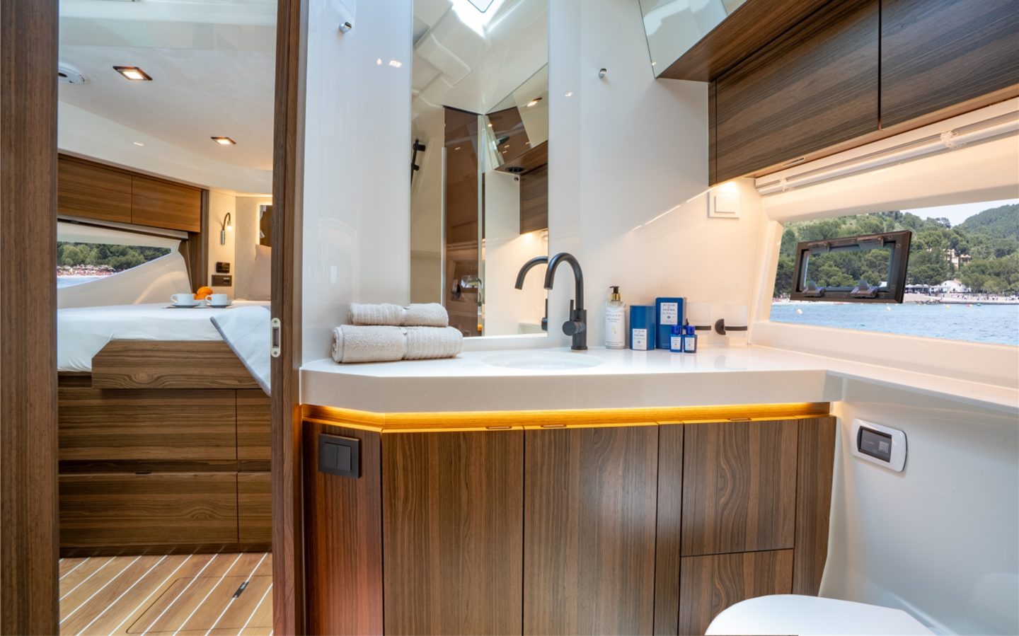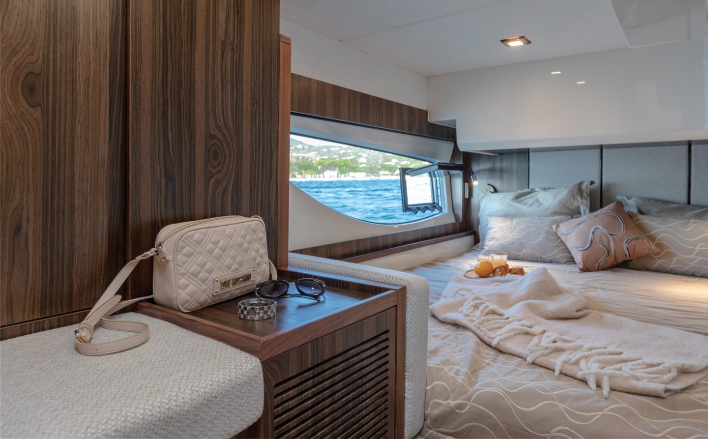 The 2-cabin version features two luxurious double cabins, both en-suite with their own walk-in showers. The 3-cabin version then offers a master double cabin forward, with two separate twin cabins mid-ships, tailored specifically towards family boating. Cleverly, this 3-cabin version retains two sperate toilet/shower rooms and extensive storage throughout in large wardrobes in each cabin, again perfect for the demands of family boating.