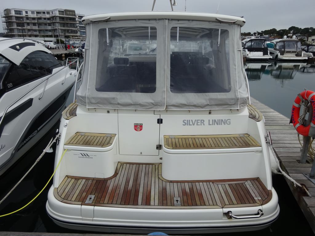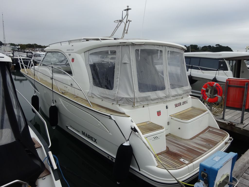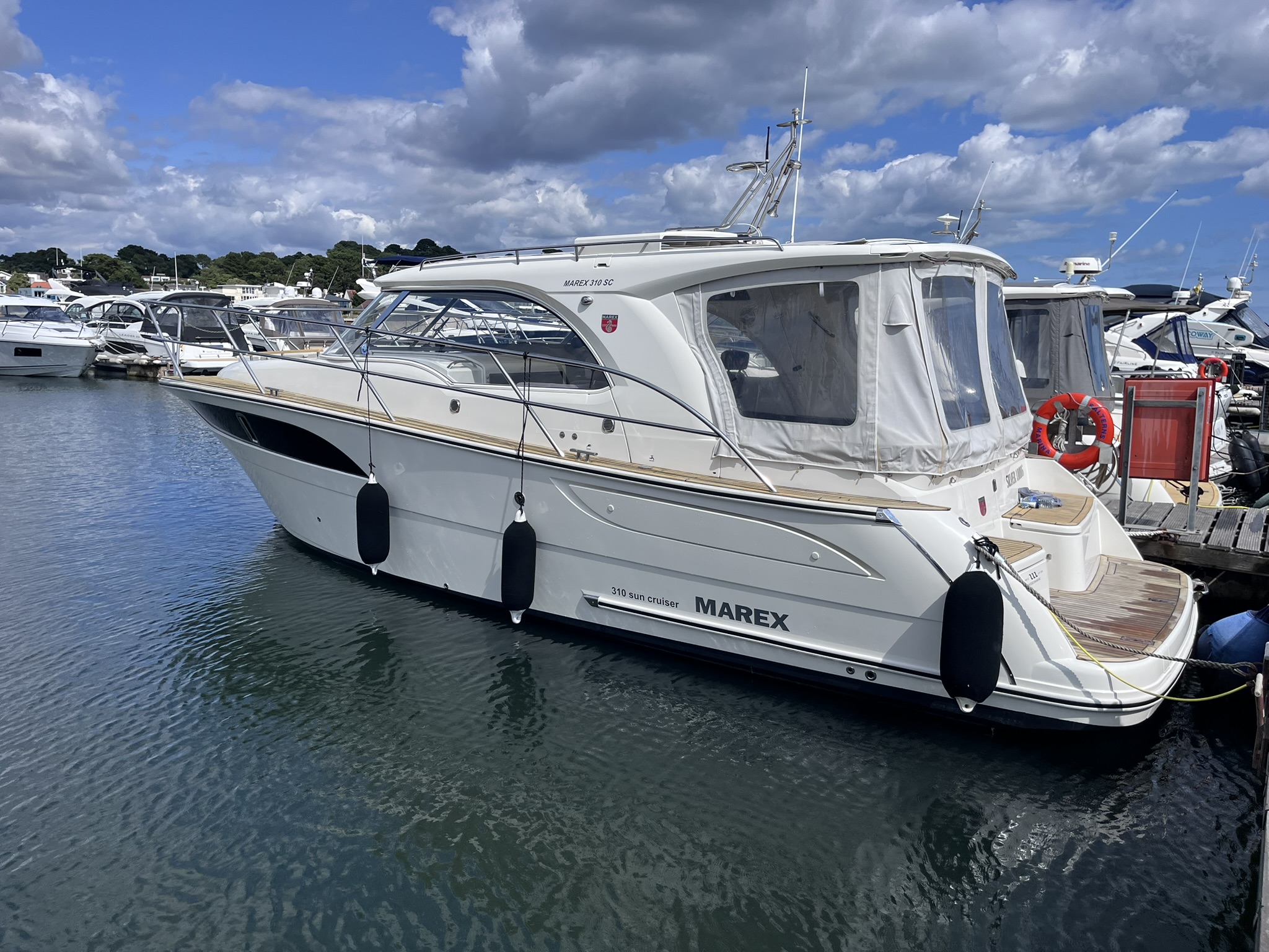 The Marex 310 has been (and still is!) one of our most popular-ever models and it continues to be a market leader with it’s fabulous cockpit, twin cabin accommodation and innovative canopy cover system. Supplied by us 2017, “Silver Lining” not only features a comprehensive specification with all the usual options, she is also nicely presented throughout having been maintained to the very highest standard from new. She is equipped with the bigger Volvo D6 370hp motor with full service history and she also benefits from a number of recent upgrades such as recently renewed canopy covers. Ready to view here at our Poole base.