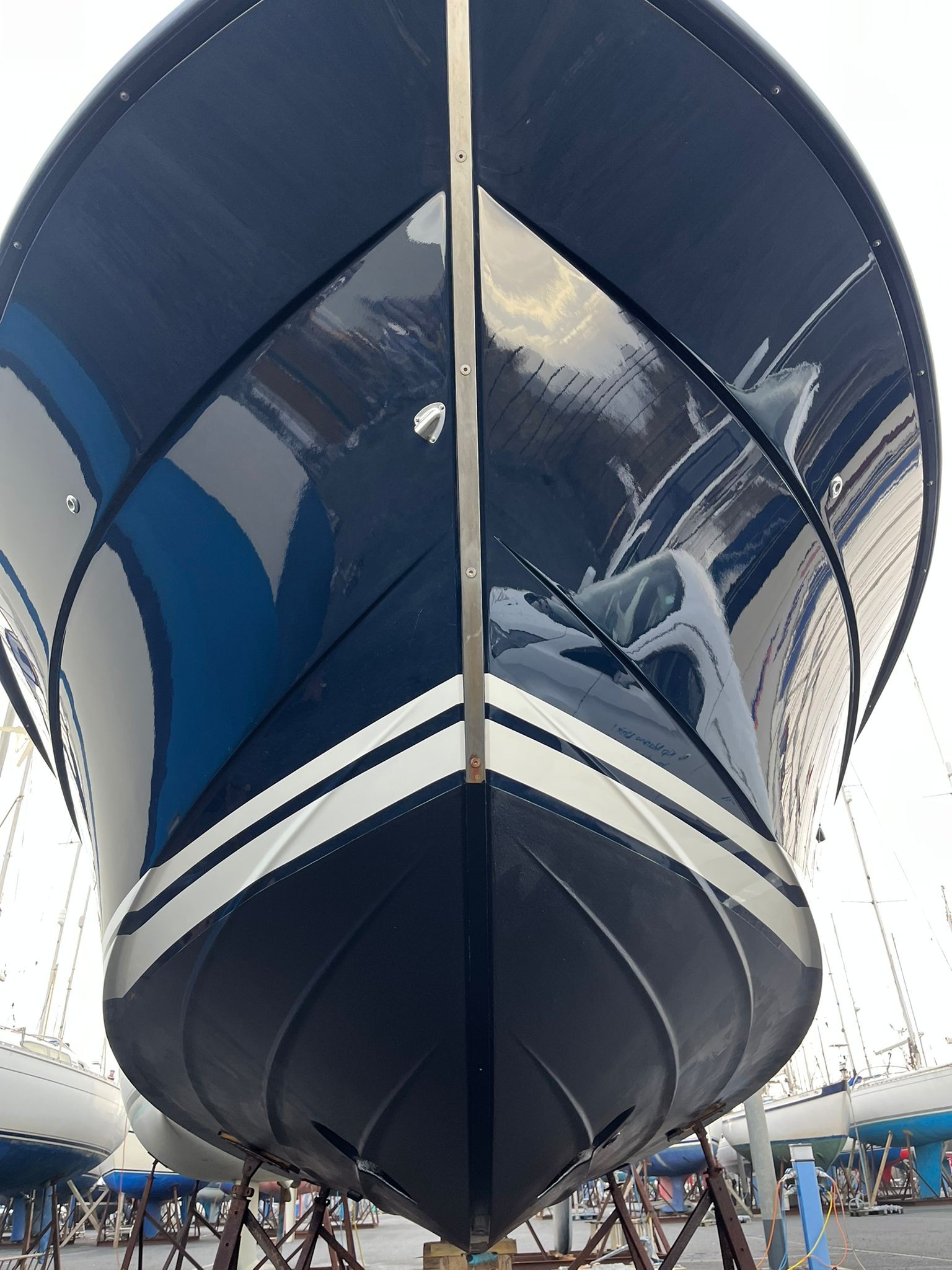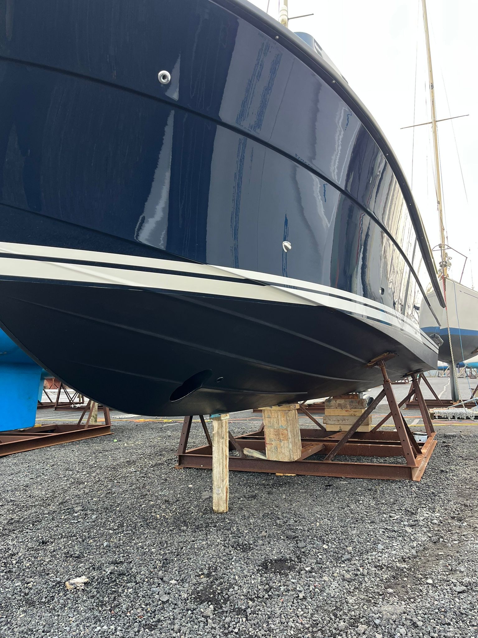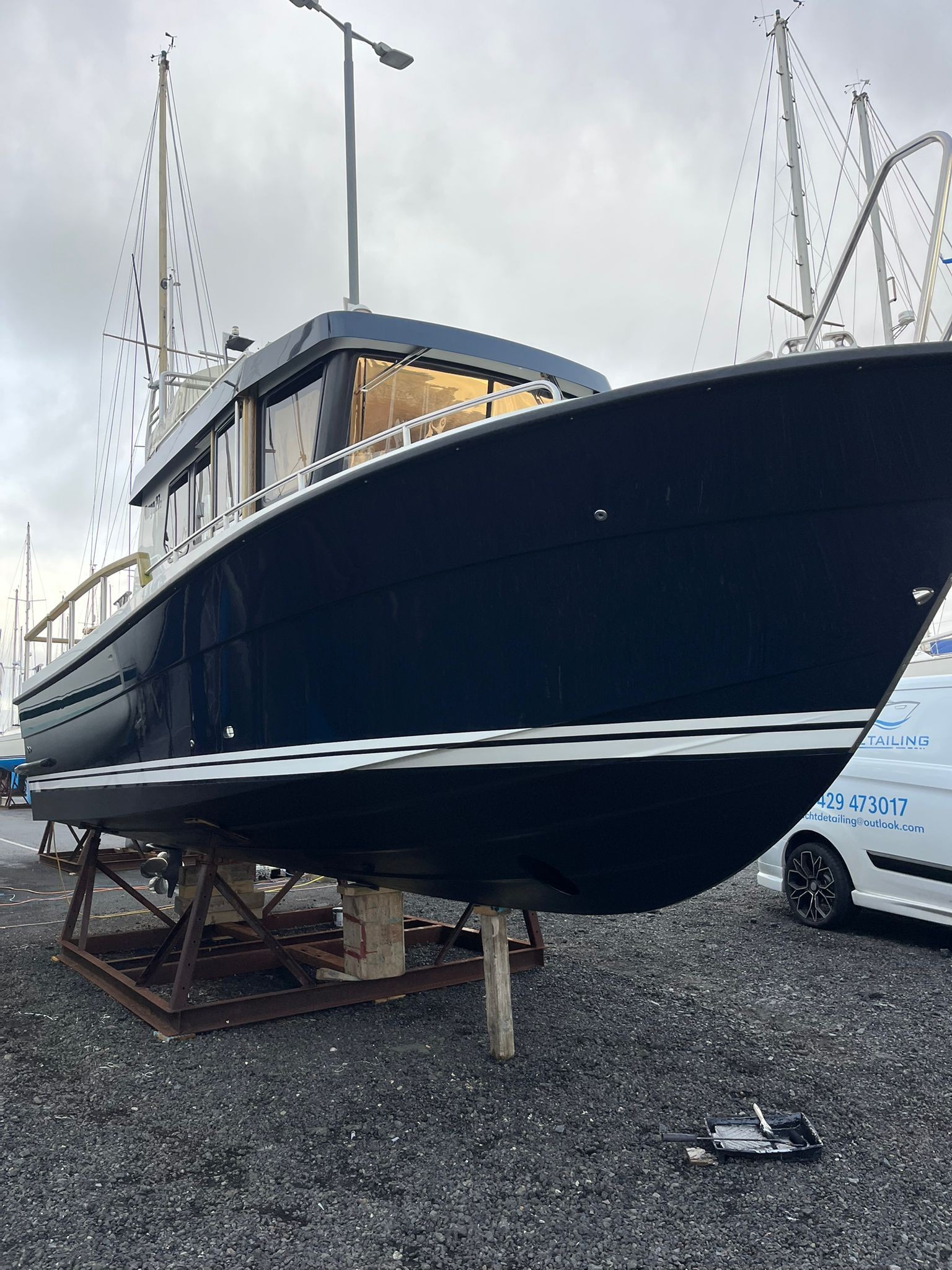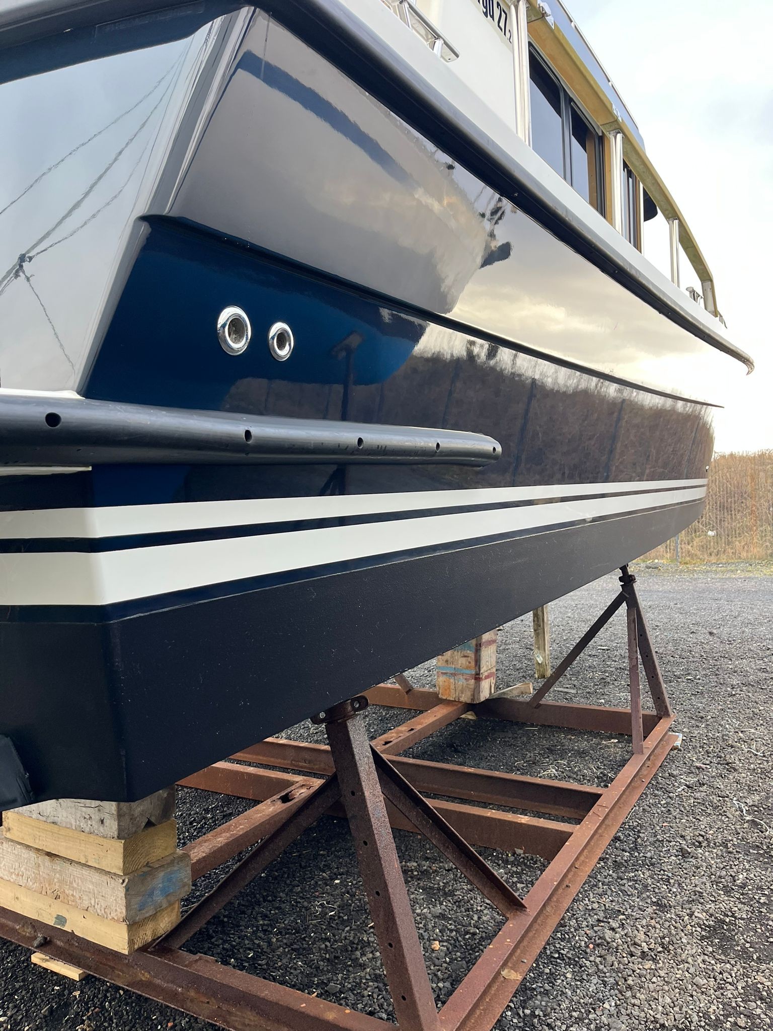 Dark blue hull – Topsides and waterlines in bright white – Two tone grey deck – BlackLine pilothouse windows – Antifouling & epoxy primer – Double transom doors – Tip-up gates in side rails – Fender holders on transom – Bathing platform hatch in GRP – Handrails on pilothouse roof – Teak table for foredeck – Table base fitting on aft deck – Lockers in aft deck corners – Teak seats foldable behind pilothouse – Teak on front seats – Teak on aft corner lockers – Teak on flybridge seat backs – Injected foam in gunwales – Bow thruster – Volvo Penta BTS trim tabs – LED lights under suncap – Shower on aft deck (hot & cold) – Gas strut on engine hatch – Bespoke cushions for foredeck seats – Flybridge instrument cover – Flybridge seat cushions – Bow thruster control on flybridge – Electric anchor winch pack on bow – Upgrade to s/s anchor – Mooring pack incl. fenders & warps – New set of batteries fitted during last service (June 2025)