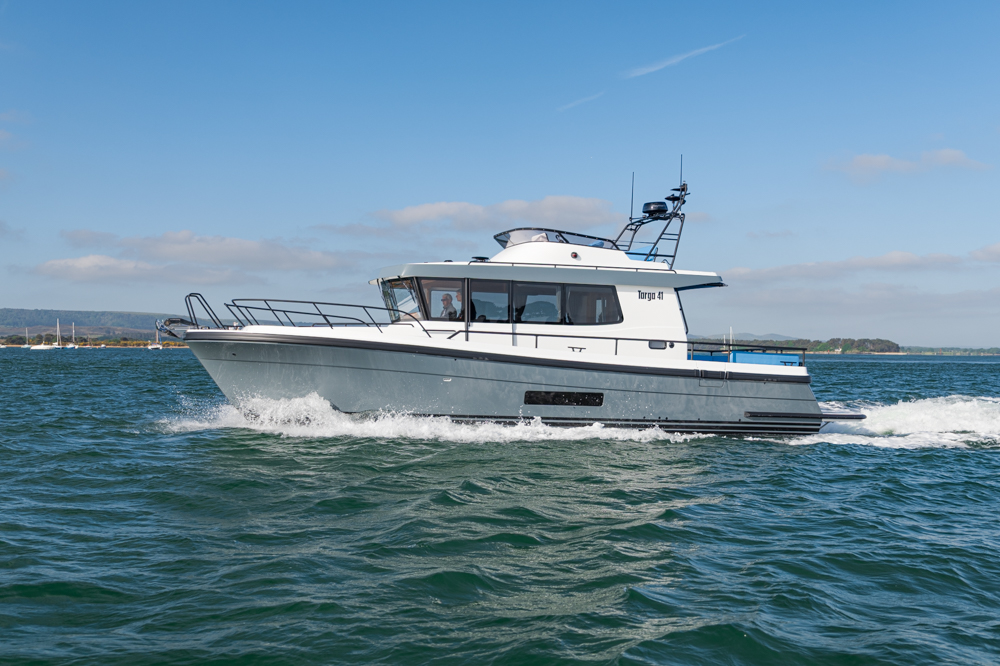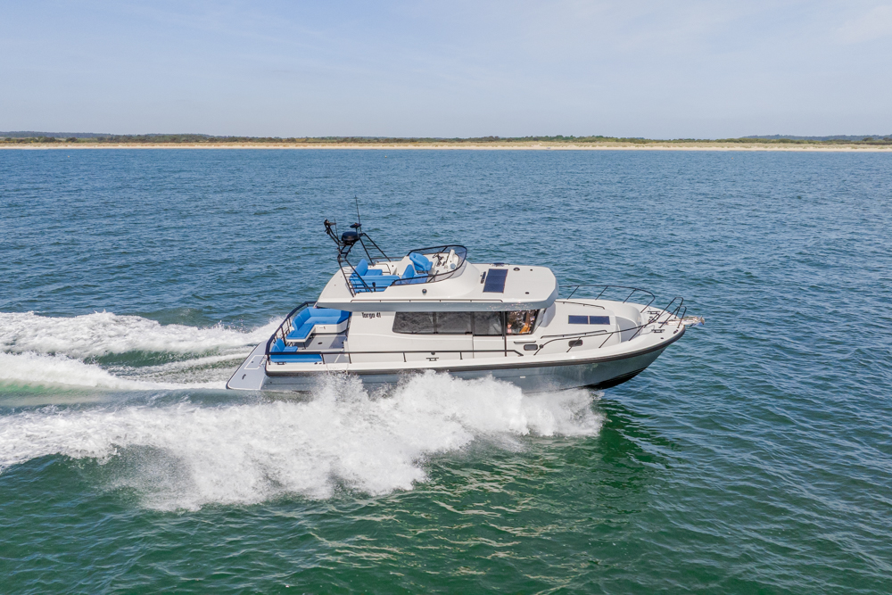 Eberspacher D4 diesel heating system – Lower angled teak module at helm – Helm console in black GRP – Reflective sun blinds on forward windows – Reflective sun blinds on door windows – Curtains on side & aft windows – Pilothouse headlining in white vinyl – LED spotlights in ceiling – H interior with passenger sofa – Extra teak folding table in pilothouse – Carpet in aft cabin grey – Pilothouse upholstery in Field Jet – Cabin upholstery in Field Granite – Toilet module complete – Upgrade to electric flush toilet (fresh water) – Septic tank gauge – Galley module complete – Dinner service in fitted drawers – Fridge (12v) – Hot water system with calorifier – Engine driven heating/demister