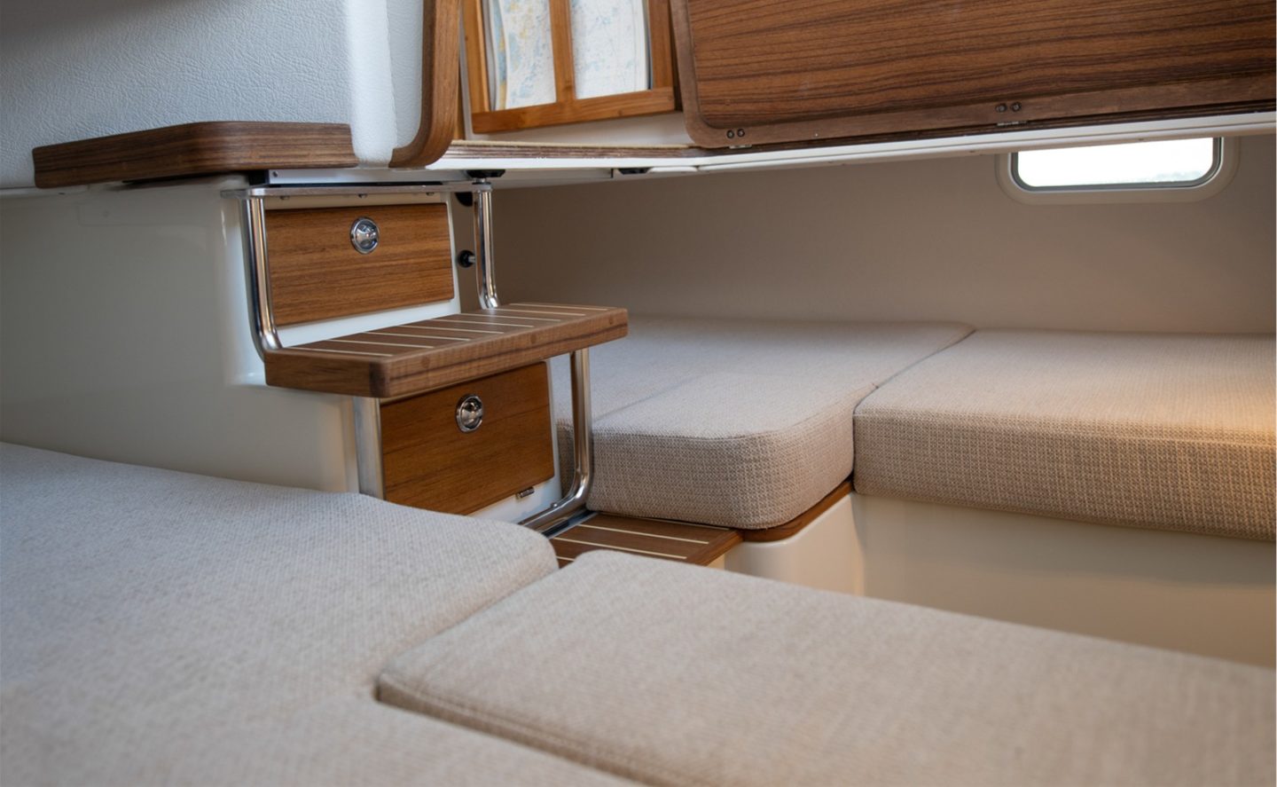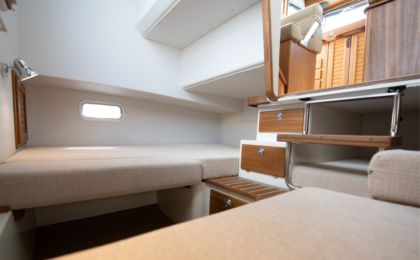 Practicality and ease-of-use are key criteria in the 27.2’s design, with it’s combination of compact size and safe walkaround decks offering owners complete confidence in a variety of environments, especially when single-handing. The functional pilothouse is smartly furnished, leading down to a comfortable aft cabin with generous double berth and double length single berth to one side. There is a separate toilet/shower compartment forward, accessed from inside the wheelhouse.