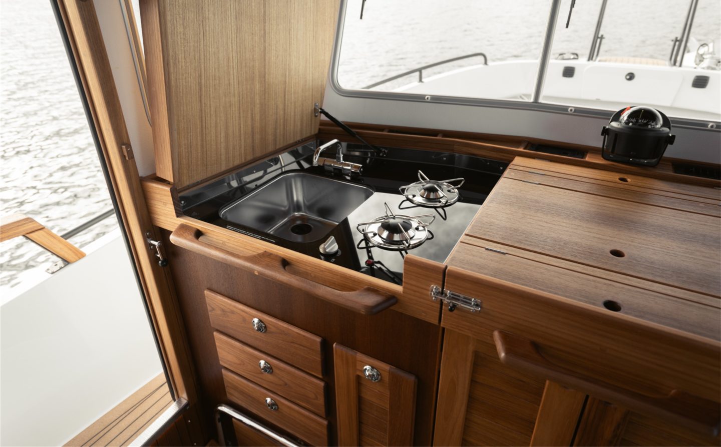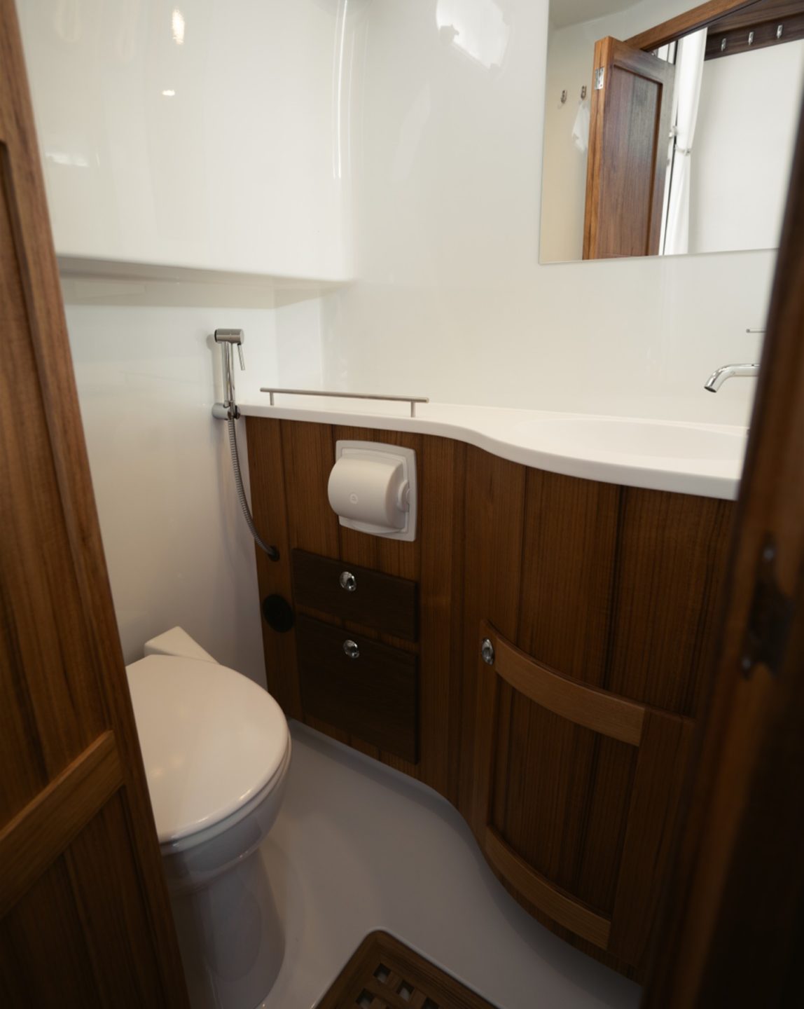 The 32 is also available with the “Comfort Fore Cabin”, initially only available on the larger models but this offers a larger forward cabin with extended headroom and a number of different bed layouts to choose from. This model is also available in “Coupe” form which removes the flybridge and instead adds an aft door for brilliant ease of access throughout the deck areas on the boat.